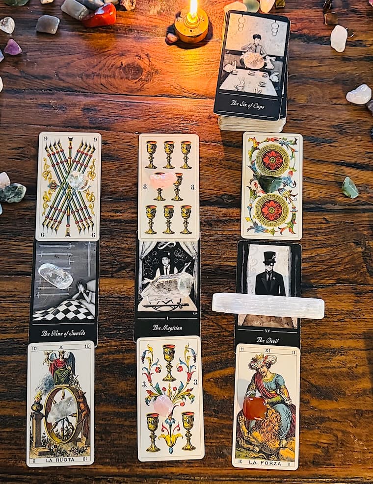 This shows stress, overthinking, or sleepless nights weighing heavily. You may feel like you’re constantly "on guard" (9 of Wands), protecting yourself from repeating past hurts. But the Wheel of Fortune suggests this cycle is shifting—your perspective or external circumstances are about to change. What feels heavy won’t stay that way; there’s a karmic turn pushing you out of this anxious loop.
