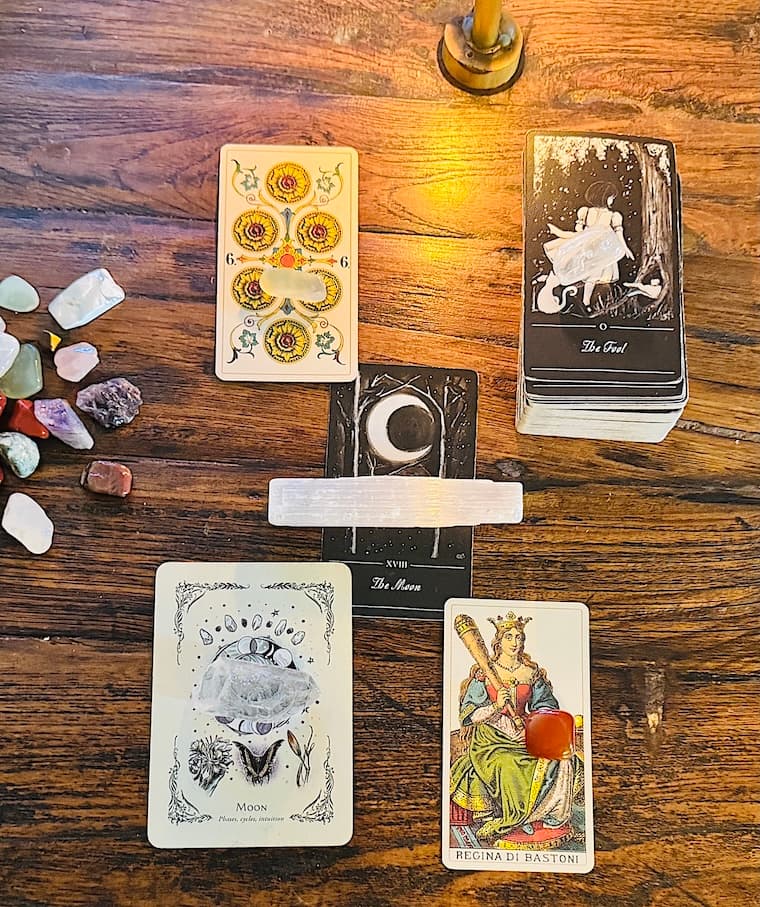 The Moon (clarified by 6 of Pentacles + Queen of Wands)