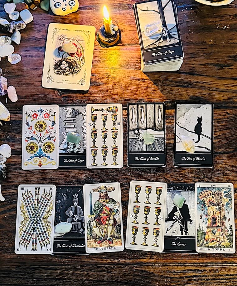 Example 2: Career or Income Redirection A person stuck in an unfulfilling job experiences a Tower moment (unexpected news, burnout, or sudden clarity) that pushes them to pursue a desire-driven path. The Lovers + Nine of Cups highlight a new career or income stream aligned with passion and long-term financial fulfillment.