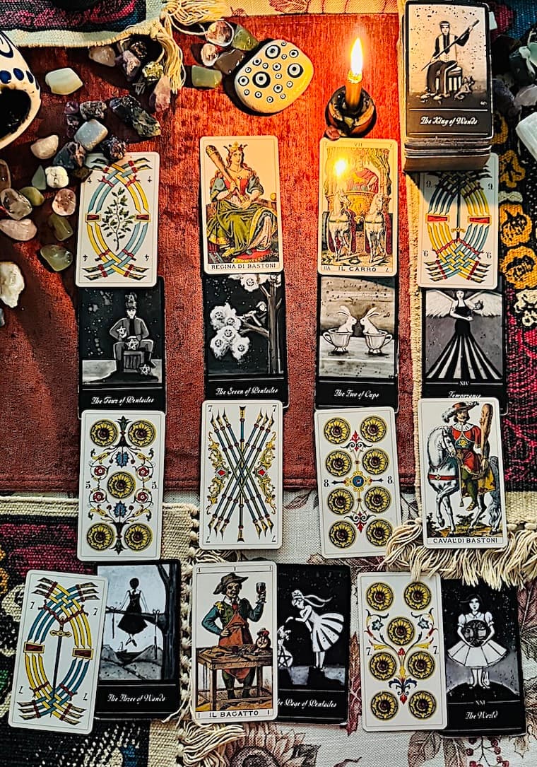 Monday – 7 of Pentacles (clarified by Queen of Wands + 7 of Wands)