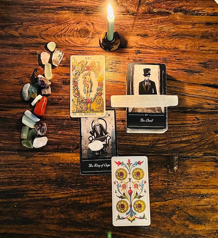 The Devil highlights potential challenges such as unhealthy attachments, fears, or limiting beliefs. This card is a reminder not to let fear of change or material obsession dictate your choices. The King of Cups calls you to rise above temptation, using emotional balance to break free from cycles that no longer serve you.