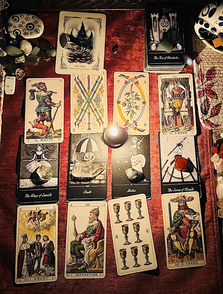 Example 2: Work or life direction (Page of Swords + Death + Chariot) A role, project, or commitment has become chaotic (Five of Wands). You end what is draining you (Death), set a clearer structure (Emperor), and move forward with a focused plan (Chariot). The result is more stability and long-term security (Ten of Pentacles).