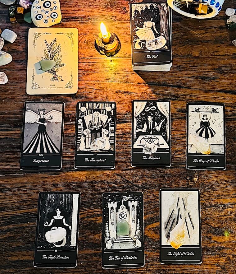 Example 1: Career or Purpose A person may receive sudden clarity about a new job or creative direction (Magician + Page of Wands). After trusting intuitive nudges (High Priestess), an opportunity arrives quickly (Eight of Wands) that aligns with long-term goals (Ten of Pentacles).