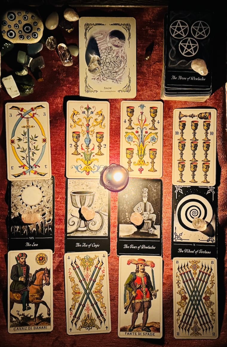 Example 1: Rebuilding after a breakup or betrayal You and someone else reconnect. The Sun brings an honest conversation about what hurt. The Knight of Pentacles shows that repair happens through consistency: clear boundaries, steady communication, and small acts of reliability. The Wheel + Eight of Wands suggests progress can be quick once trust-building is structured.